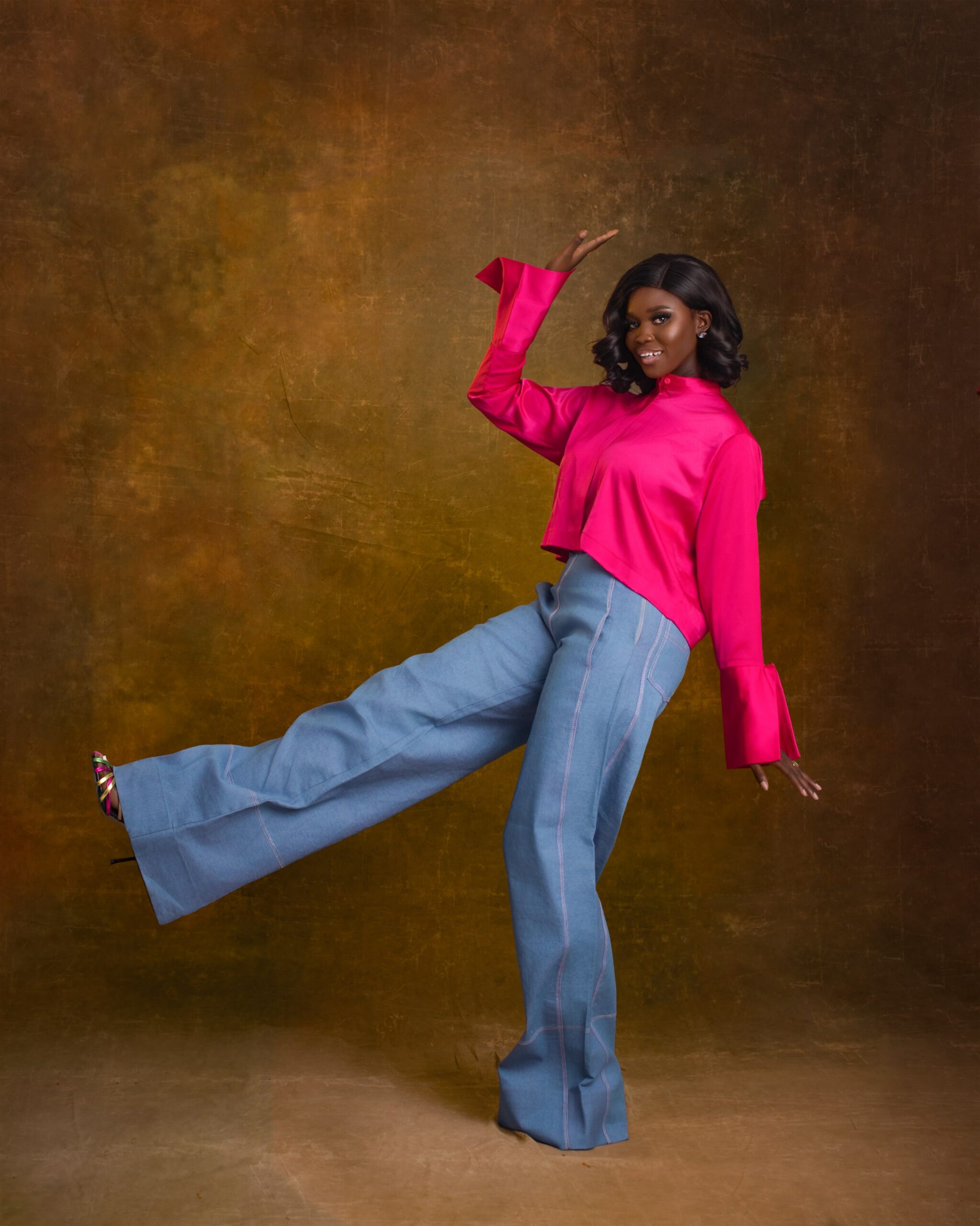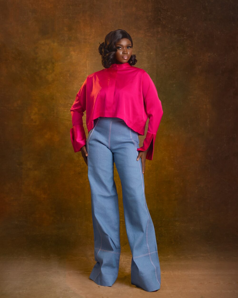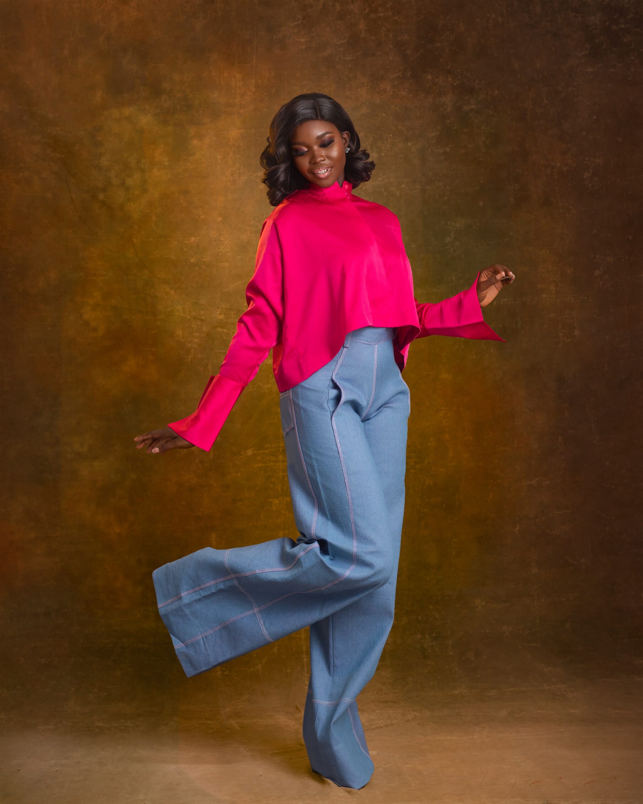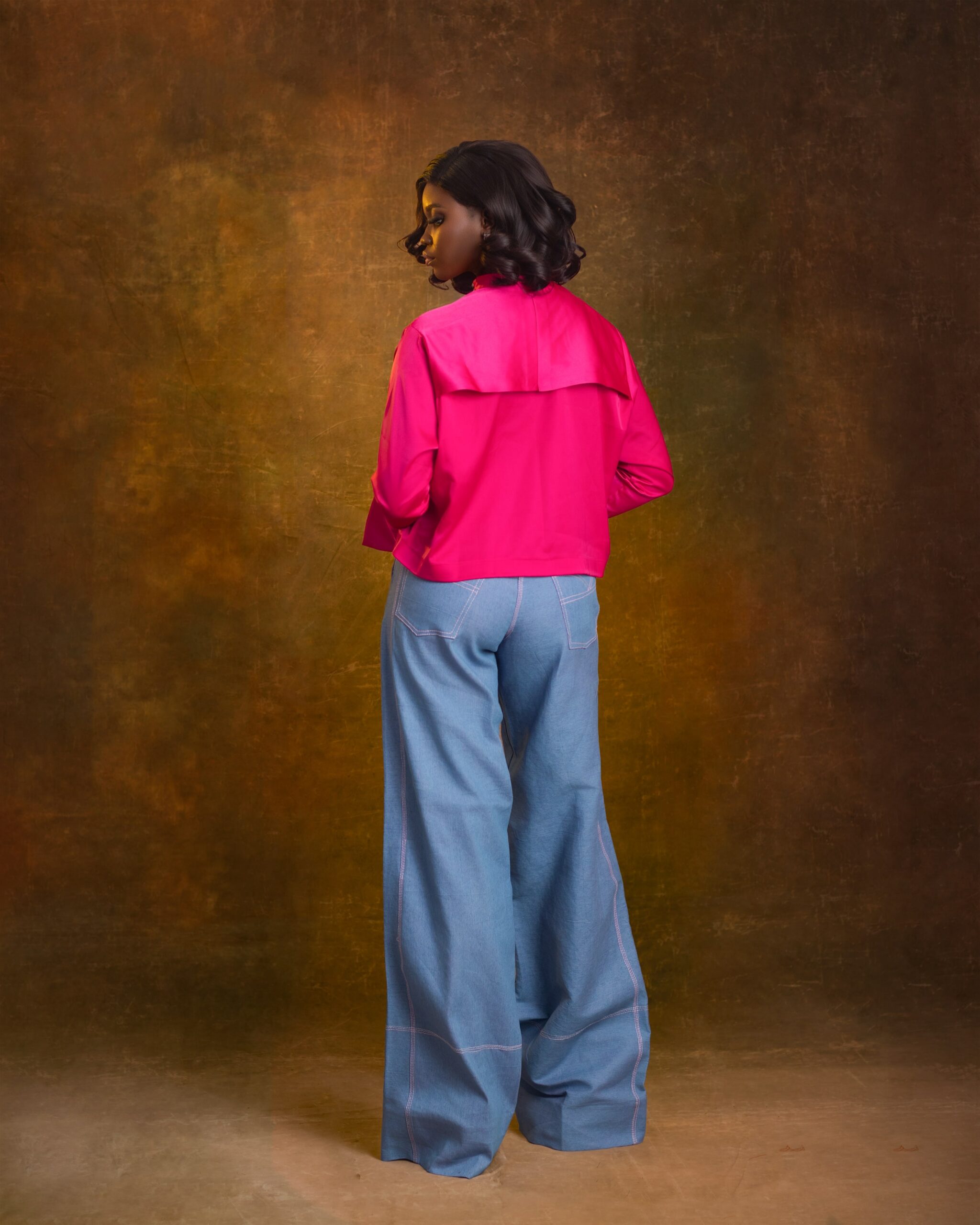 The Contour denim pants are where structure meets style. Tailored with precision and defined with soft pink contrast stitching, this wide-leg beauty sculpts the waist and elongates the legs. A confident choice for modern elegance.