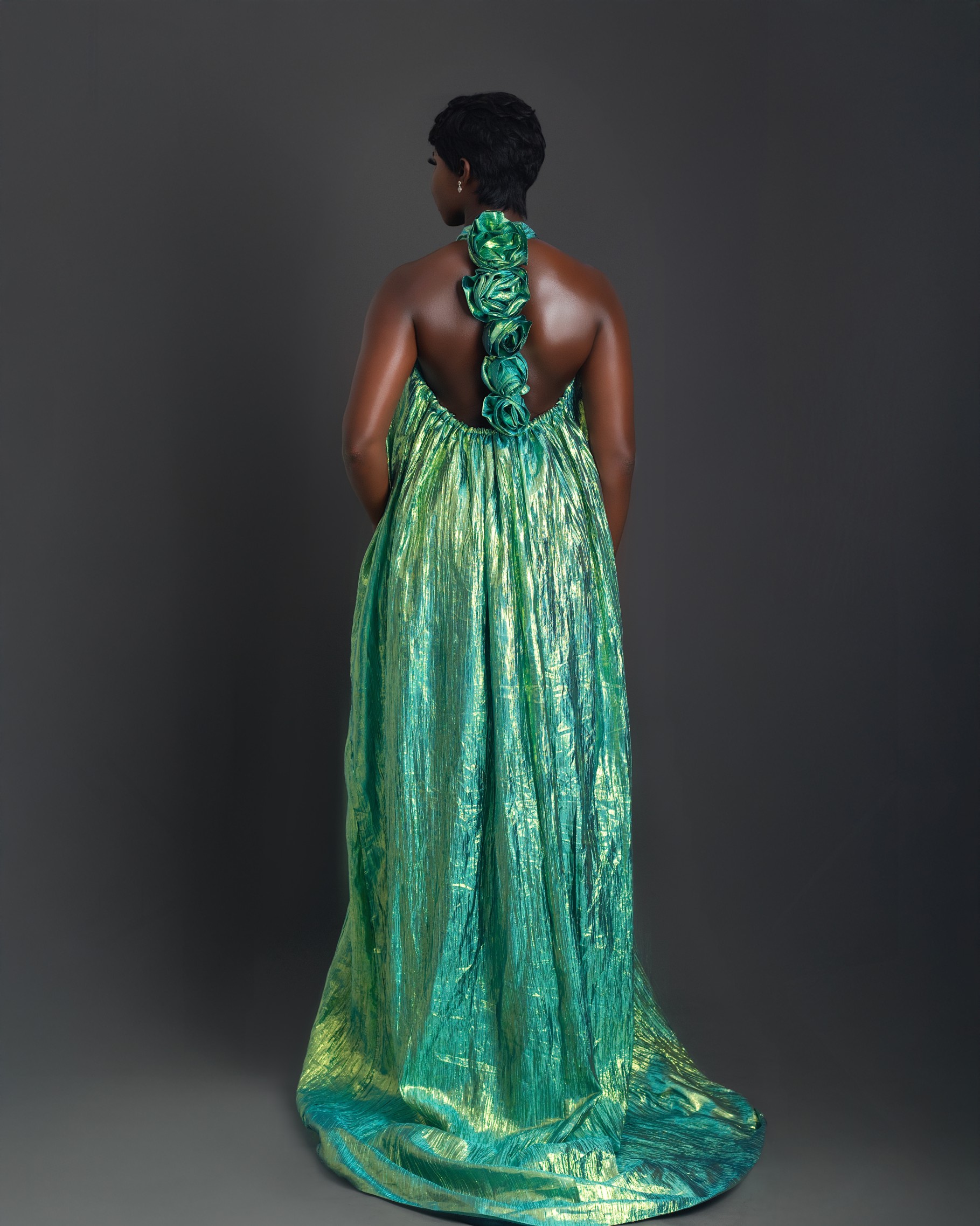 A breathtaking Halter neck iridescent evening gown with column of handmade roses at the back. Its soft cascading silhouette creates an ethereal, goddess-like presence. A perfect choice for your high-value occasions including red carpets and anniversaries
