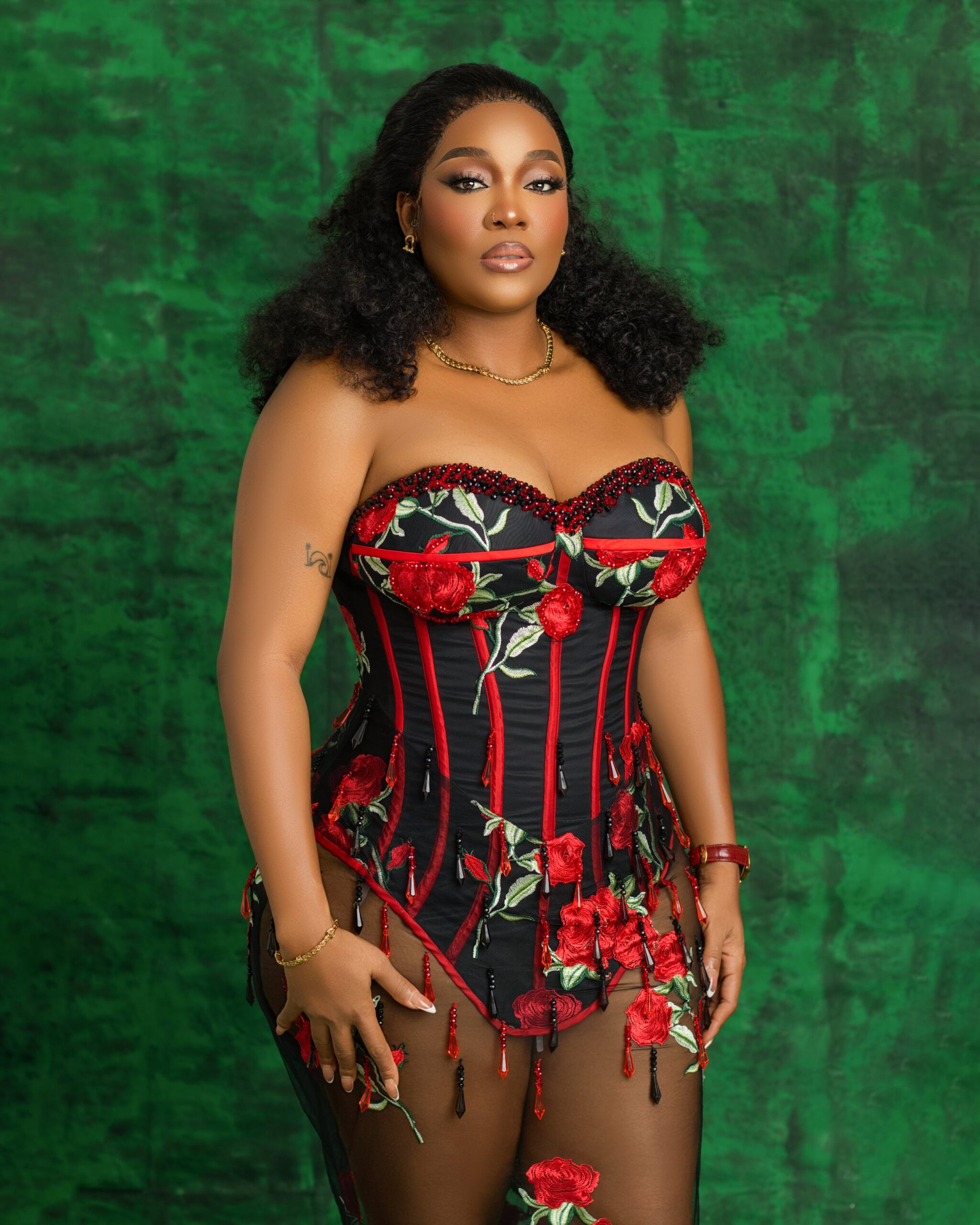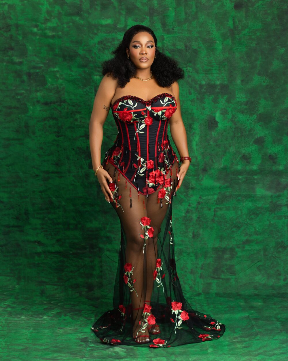The Scarlet Bloom Corset Gown is an exquisite fusion of romance and allure featuring a structured, curve-defining corset with intricate red floral embroidery on a deep black base. The sheer tulle skirt, adorned with hand-appliquéd roses, creates a breathtaking illusion of walking through a field of blooming flowers. Whether for a high-fashion event, gala, or luxury soirée, this gown is designed to make you unforgettable.