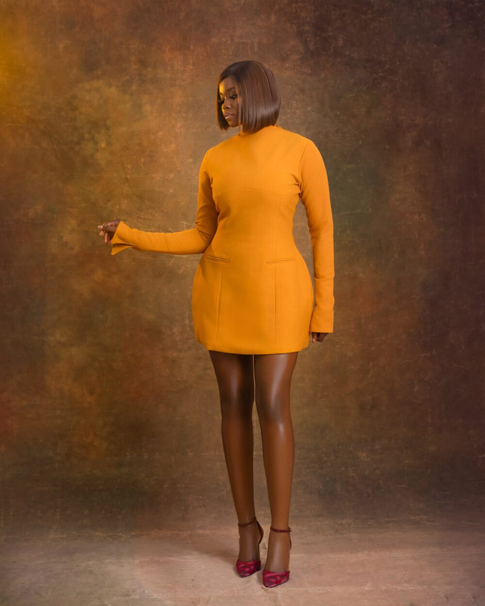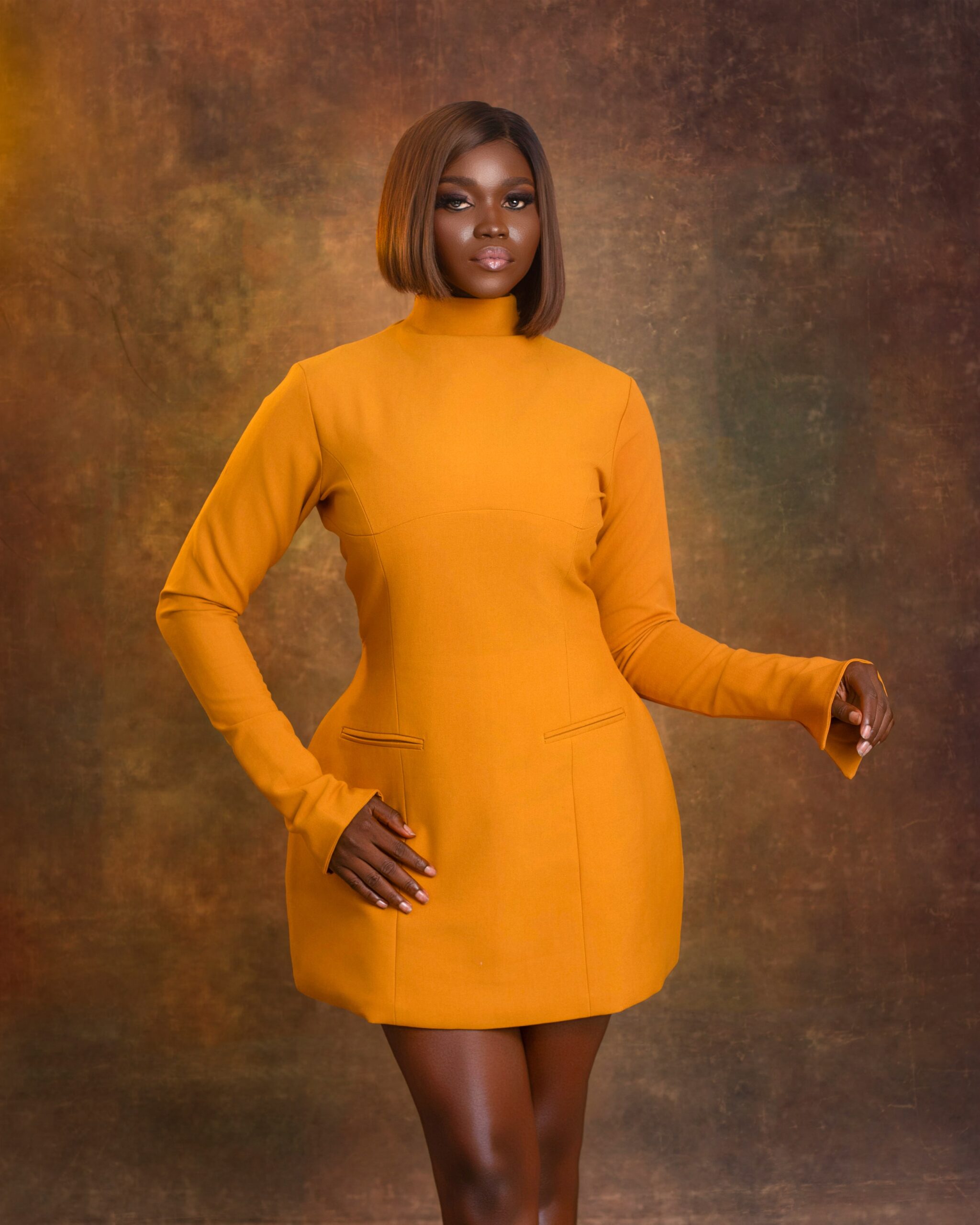 Turn every entrance into a golden hour moment with Solaria—Nonnistics’ statement mini that marries bold color with refined architecture. Tailored in a rich mustard crepe, the dress features a sculpted turtleneck that frames the face with modern poise, while full-length sleeves flare into graceful funnel cuffs for subtle drama.